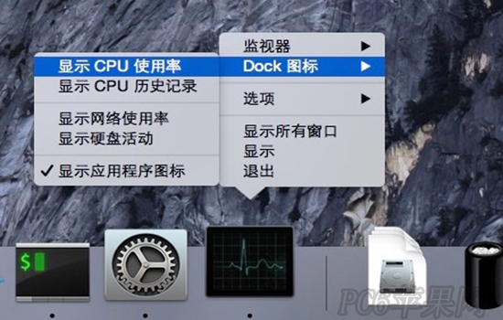 但是像這樣跳出一個窗口,的確方便查看了,但是這個圖標太突兀了,也不那么美觀。所以重點來了,我們依然右鍵點擊圖標,選擇“Dock 圖標 - 顯示 CPU 使用率”,這樣我們就可以選擇我們需要的顯示圖標了。