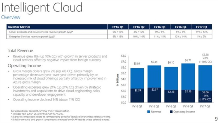 微軟2017財年第1財季報告出爐,而財報中公布的各項數據也成為媒體關注的焦點。其中最值得關注的是由于SurfacePro4和SurfaceBook銷量的強勢表現,使Surface產品線的總營收相比去年同期增長38%(不計入匯率變動影響同比上升39%),而手機業務營收同比下降72%(不計入匯率變動影響同比下滑71%)。智能云業務同比增加8%,相比較…...