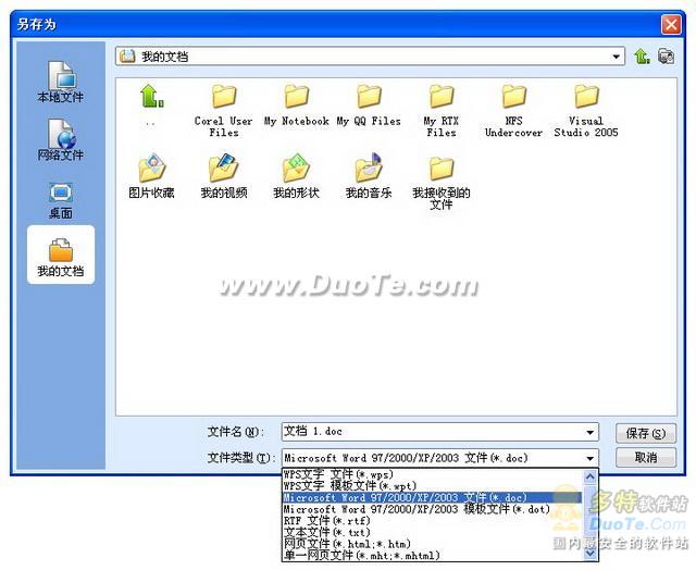如果當(dāng)前的擴展名為“*.wps”,您可以改成“Microsoft 97/2000/XP/2003 文件”的“*.doc” 格式,如下圖所示: