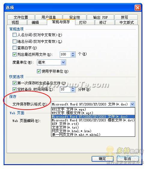 如果您希望默認(rèn)保存格式為“*.doc” ,點擊菜單“工具|選項”命令,彈出“選項”對話框。在“常規(guī)與保存”選項卡下的“文檔保存默認(rèn)格式”中選擇“Microsoft word97/2000/XP/2003 文件(*.doc)”即可將默認(rèn)格式改為doc,如下圖所示: