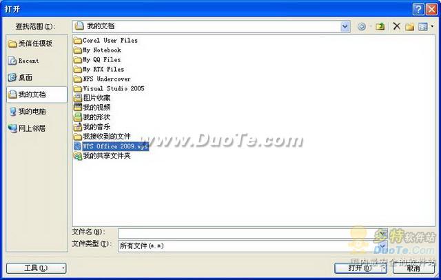在MS Office中打開文件時,在“選擇文件類型”中選擇“所有文件(*.*)”,即可打開wps格式的文件,如下圖所示: