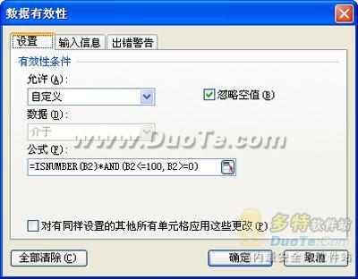 步驟2.在設(shè)置“數(shù)據(jù)有效性”|“條件”|“允許”處選擇“自定義”;在公式處輸入=ISNUMBER(B2)*AND(B2<=100,B2>=0)(見(jiàn)圖2)。