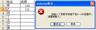 測(cè)試:在B2:B11區(qū)域輸入大于100或者小于0或者“ABC”等等數(shù)據(jù)看,系統(tǒng)將彈出提示并阻止您的輸入。從而確保成績(jī)錄入的范圍正確性(見(jiàn)圖3)。