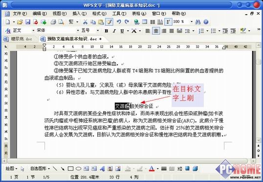 第三步:點擊文檔標(biāo)簽并切換到目標(biāo)文檔中,將帶有格式刷標(biāo)志的鼠標(biāo)光標(biāo)向文字上進(jìn)行拖曳,這樣格式就“克隆”到目標(biāo)文檔的相應(yīng)文字中了(如圖2)。