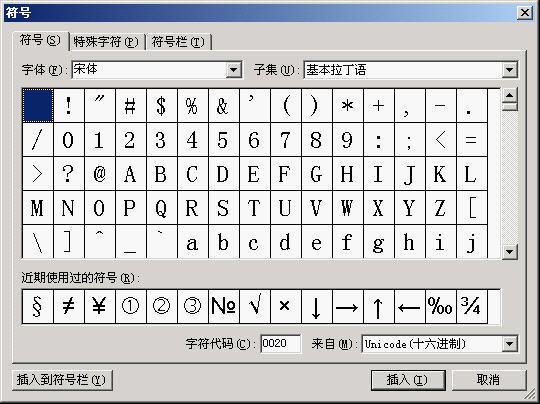 執(zhí)行菜單項(xiàng)“插入|符號”,就會彈出“符號”對話框,如圖2