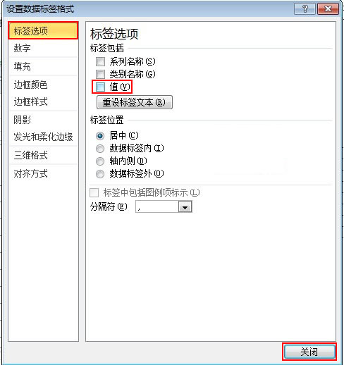 2、彈出“設(shè)置數(shù)據(jù)標(biāo)簽格式”對(duì)話框,選擇“標(biāo)簽選項(xiàng)”功能欄,在“標(biāo)簽包括”選項(xiàng)組中撤選“值”復(fù)選框即可。