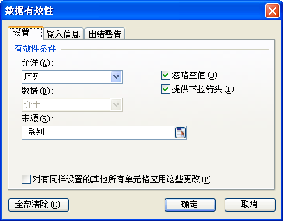 2.在“允許”下拉列表中選擇“序列”,在“來源”框中輸入公式“=系別”,見圖B所示。然后單擊“確定”按鈕返回工作表。