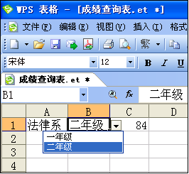 2.在單元格B1單元,下拉列表中產生法律系對應的兩個年級。從中選擇“二年級”,在C1單元格將會自動產生查詢結果:外語系三年級的成績84。見圖D所示;