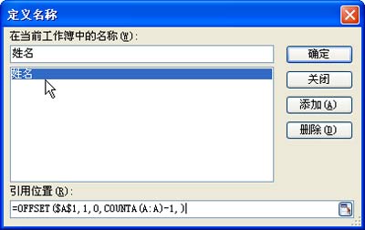 選擇《成績表》A1,點擊【插入】【名稱】【定義】,然后按圖3方式輸入信息:當前工作簿的名稱處輸入“姓名”(不含引號),在引用位置處輸 入“=OFFSET($A$1,1,0,COUNTA(A:A)-1,)”。公式含義:通過COUNTA(A:A)-1返回A列學生數目,減1是因A列中 非空單元格數量包括首行“姓名”二字;然后利用OFFSET函數提取A列所有學生姓名。