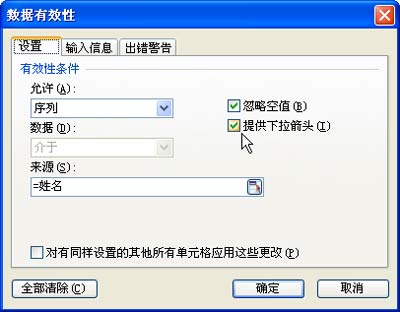 進入《通知單》單元格A4,點擊【數據】【有效性】【設置】,在有效性條件之允許處選擇條件為序列,來源處輸入“=姓名”,同時確保右邊“提供下拉箭頭”前已打勾(見圖4),確定后點擊單元格I4試試效果(見圖5)