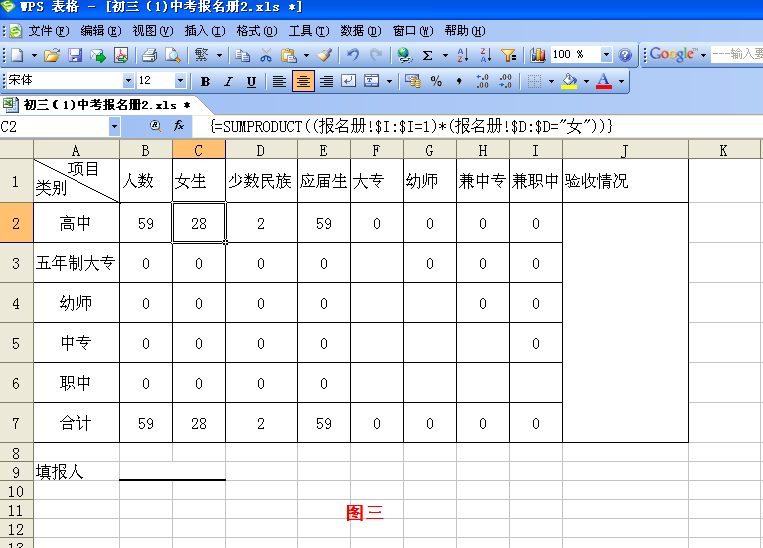 在B3單元格輸入“=SUMPRODUCT((報名冊!$I:I="")*(報名冊!$J:J=2))”統計出報考大專的學生人數,該函數的含義是:當 “報名冊”工作表中的S列的某單元格信息為空值,而J列對應的單元格有信息,則判斷為該生報考大專,在B3中返回報考大專的學生人數。