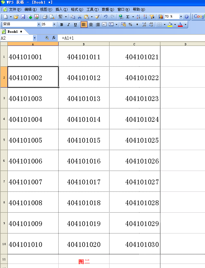 假如第一考場的考號是404104001至404104030,我們只需在A1中輸入404104001,其余號碼自動生成,點擊打印即可完成一個考場的桌簽的制作(如圖二)。