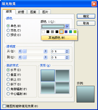 2、在彈出的“填充效果”對話框里,選中“顏色”標(biāo)簽下的“單色”單選項后,單擊“顏色1”標(biāo)簽下的色塊,在彈出的下拉列表里單擊“其他顏色…”選項(如圖3),在彈出的“顏色”對話框里單擊“標(biāo)準(zhǔn)”標(biāo)簽后,再單擊調(diào)色盤中的紅色色塊(如圖4),單擊“確定”按鈕返回“填充效果”對話框。