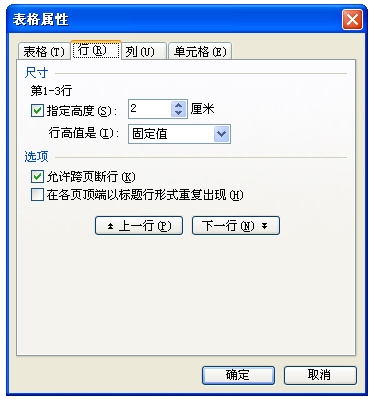 第二步:表格行高巧設置。將表格內容輸入好后,鼠標選擇表格上的“1-3”行,鼠標右鍵單擊所選區域,在出現的快捷菜單中選擇“表格屬性”,在“表格屬性”設置框中單擊“行”標簽,在“尺寸”提示欄下“第1-3行”提示下勾選“指定高度”,并在其后的設置欄內設置“2厘米”,在“行高值是:”設置欄內選擇“固定值”,單擊“確定”。如圖2所示。
