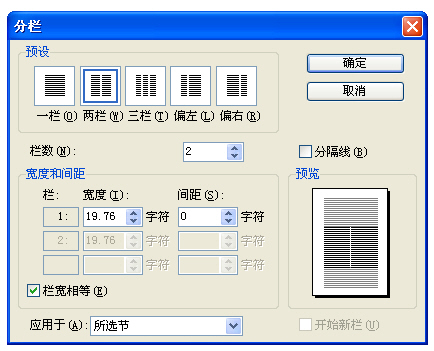 第四步:分欄參數細設定。鼠標單擊“視圖”菜單,在出現的下拉菜單中單擊“頁面”命令。鼠標選擇表格上的所有文字內容及鼠標所在的段落標記。鼠標單擊“格式”菜單,在出現的下拉菜單中單擊“分欄”命令,在出現的“分欄”提示框內“預設”提示欄下選擇“兩欄”圖標,勾選“欄寬相等”前的對勾,并將“寬度和間距”提示欄下“間距”設置欄內的數值設為“0字符”,并在“應用于”提示欄內選擇“所選節”,鼠標單擊“確定”。如圖6所示。