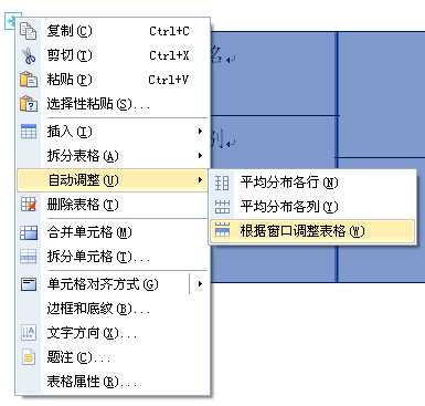 鼠標左鍵單擊表格左上角出現的十字箭頭,在出現菜單中選擇“自動調整”子菜單下的“根據窗口調整表格”命令。如圖7所示。