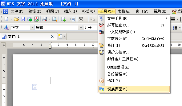 2、在經(jīng)典風(fēng)格界面下,單擊“工具”菜單下的“切換界面”命令(如圖6),在彈出的“切換界面”話框里單擊“確定”按鈕(如圖7)后,重新啟動(dòng)WPS2012即可切換回2012風(fēng)格界面。