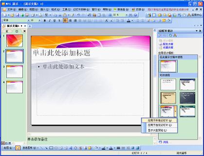 第二步,使用自動(dòng)的幻燈片設(shè)計(jì),有已經(jīng)配好的背景色和格式,方便直接使用。“格式”——“幻燈片設(shè)計(jì)”,如圖2,選中一種設(shè)計(jì)方案,應(yīng)用到所有幻燈片(因?yàn)橐L(fēng)格統(tǒng)一,所以選用一致的設(shè)計(jì)方案;如果有特別需要,也可以在同一個(gè)幻燈片中使用多種設(shè)計(jì)方案)。