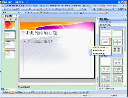 第三步,根據(jù)需要微調(diào)各個(gè)版式的格式。在菜單欄選擇“格式”——“幻燈片版式”,根據(jù)需要為每張幻燈片選擇版式,有多種版式可以選擇。如圖3