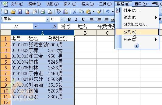 2.選中A列,在“數(shù)據(jù)”菜單中,單擊“分列”命令,如圖3。