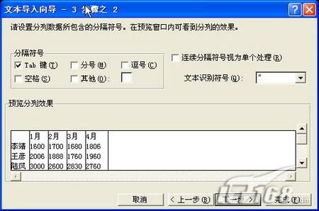 在這一步我們可以選擇不同的分隔符,并能實(shí)時(shí)預(yù)覽分隔效果。因?yàn)槲覀兊奈谋疚募荰ab鍵來(lái)分列的,所以選擇Tab鍵作為我們的分隔符號(hào)。