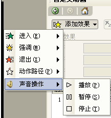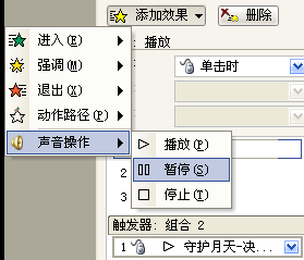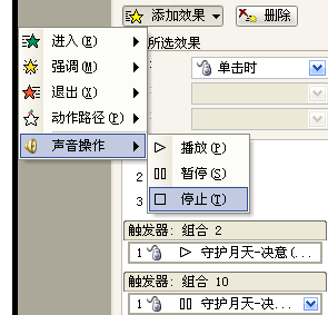 回到“自定義動(dòng)畫”,看到以下畫面:選擇“聲音操作”中的“停止”: