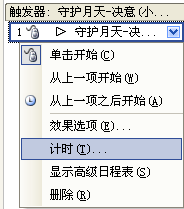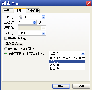 選“計(jì)時(shí)”,出現(xiàn)如下畫面:點(diǎn)“觸發(fā)器”,在“單擊下列對(duì)象時(shí)啟動(dòng)效果”右側(cè)的下拉框選擇觸發(fā)對(duì)象選擇“組合 2(即播放按鈕)”,單擊“確定”。