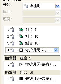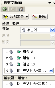 點(diǎn)觸發(fā)器,在“單擊下列對(duì)象時(shí)啟動(dòng)效果”右側(cè)的下拉框選擇觸發(fā)對(duì)象選擇“組合 10(即暫停按鈕)”,“確定”。