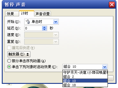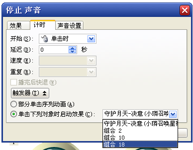 選擇其中的“計(jì)時(shí)”選項(xiàng),點(diǎn),在“單擊下列對(duì)象時(shí)啟動(dòng)效果”右側(cè)的下拉框選擇觸發(fā)對(duì)象選擇“組合 18(即停止按鈕)”,確定。