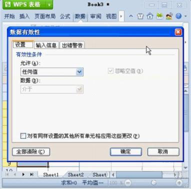 首先,在WPS表格的工具欄中找到“數據”選項卡,點擊進去后選擇“有效性”按鈕,打開數據有效性對話框,如圖2所示。