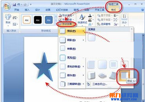 3、選中“五角星”形狀后,在“格式”上下文選項卡的“形狀樣式”選項組中單擊【形狀效果】按鈕,在隨即打開的下拉列表中選擇“預設12”效果,此時的“五角星”形狀便呈現為三維效果,如圖3所示。