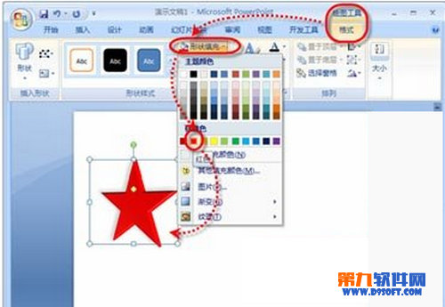 4、用戶還可以改變圖形的顏色,并且改變后的顏色也會自動應用相應的三維圖形效果。如把五角星顏色更改為紅色,在“格式”上下文選項卡中單擊【形狀填充】按鈕,在下拉列表中選擇“紅色”。