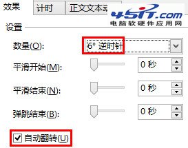 對于陀螺旋動畫,設置較小的角度(案例選擇了6度逆時針,因為矩形開始順時針旋轉了3度),并勾選”自動翻轉”,設置好重復的次數.具體如下圖: