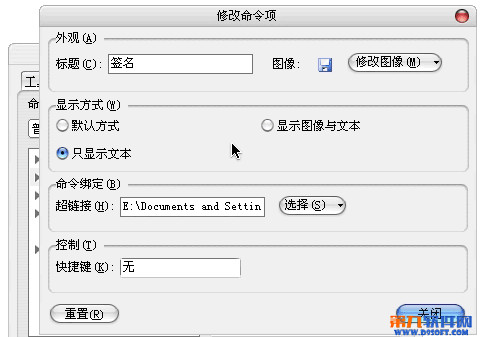 在自定義窗口的右側(cè)命令列表中雙擊剛添加的“保存”命令項(xiàng)打開(kāi)“修改命令項(xiàng)”對(duì)話框。輸入標(biāo)題為“簽名”,顯示方式則選中“只顯示文本”單選項(xiàng)。接著單擊命令綁定的“選擇”按鈕,在下拉列表中選擇“插入圖片”,在彈出對(duì)話框中選擇打開(kāi)要插入的個(gè)人簽名的圖片文件。然后把輸入光標(biāo)定位到快捷鍵的輸入框中按Delete鍵刪除原有快捷鍵,以免干擾原來(lái)的保存快捷鍵。當(dāng)然在此你也可以自己指定另外一組新的快捷鍵。最后單擊關(guān)閉完成設(shè)置,再關(guān)閉退出自定義窗口。