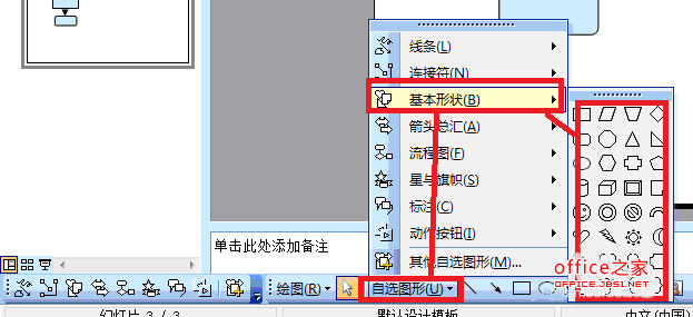 4、我們把繪圖欄打開(kāi)之后,里面有許多基本的繪圖所需要的圖形。也可以直接選擇流程圖,直接選擇流程圖和我們自己用圖形拼裝起來(lái)的流程圖最大的不同就是,選擇流程圖選項(xiàng)之后所做成的流程圖可以進(jìn)行自我修正。