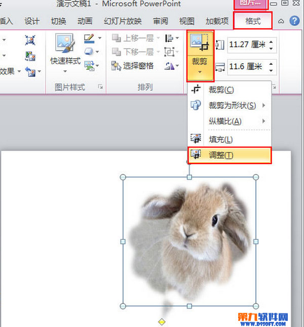 [2] 這時(shí)候圖片邊框已經(jīng)自行調(diào)整為云形標(biāo)注的樣式,但是對(duì)主體顯示位置不太滿意,我們可以單擊【裁剪】下拉列表中的【調(diào)整】。