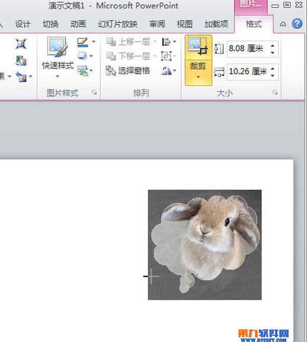 [1] 切換到【圖片工具】下的【格式】選項(xiàng)卡,在【大小】選項(xiàng)組中單擊【裁剪】,在彈出的下拉列表中選擇【云形標(biāo)注】。