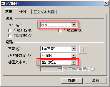 然后再次點(diǎn)擊“添加效果→強(qiáng)調(diào)→放大/縮小”,完成后雙擊動(dòng)畫列表中的“放大/縮小”項(xiàng),在設(shè)置面板中注意將“尺寸”由默認(rèn)的“150%”改為“50%”或其它合適的比例,將“動(dòng)畫文本”項(xiàng)由默認(rèn)的“按字母”改為“整批發(fā)送”(圖2)。