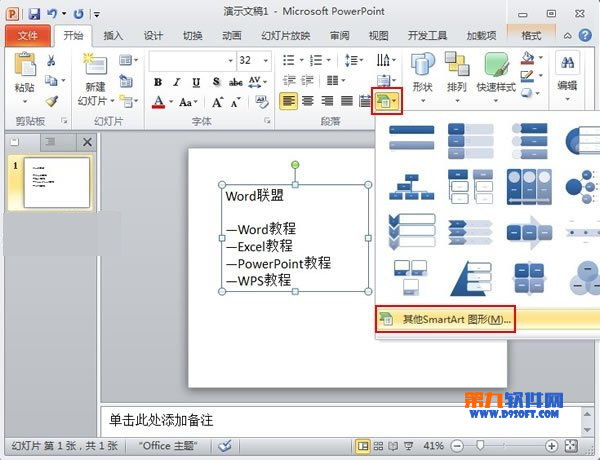 ①打開powerpoint2010,編輯文字,選中文本框,單擊開始菜單里面的轉換為SmartArt圖形按鈕。