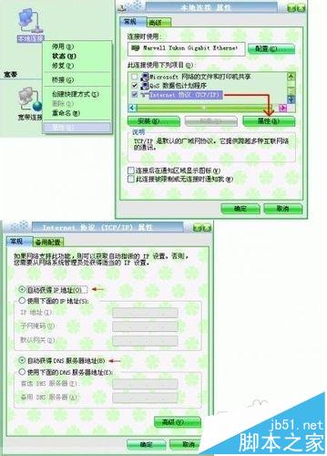 2、設置計算機:每臺計算機最好都照如下設置:網絡鄰居-右鍵-屬性,本地連接-右鍵-屬性,TCP/IP屬性,自動獲取。