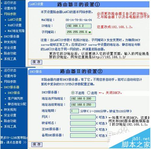 要點:更改第二個路由器自己的IP地址,關閉它的DHCP。
