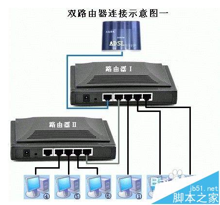 此種方式將路由器Ⅱ當作集線器(HUB)使用,在某種意義上來說可以看成是透明的。因此所有的計算機的地位是平等的,訪問局網共享也毫無阻力。但此種方法會消耗掉2個LAN口,因此多加一個4口路由器只能最多接6臺電腦。因為路由器Ⅱ幾乎是透明的,因此接路由器Ⅱ的電腦的網關應該和①②③臺電腦一樣是路由器Ⅰ的IP地址,但是由于路由器Ⅱ的DHCP可能造成分配IP地址給④⑤⑥時把網關設置成自己,因此在上面需要指定一下。