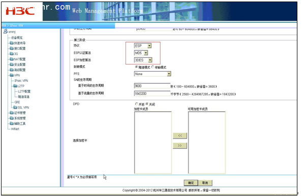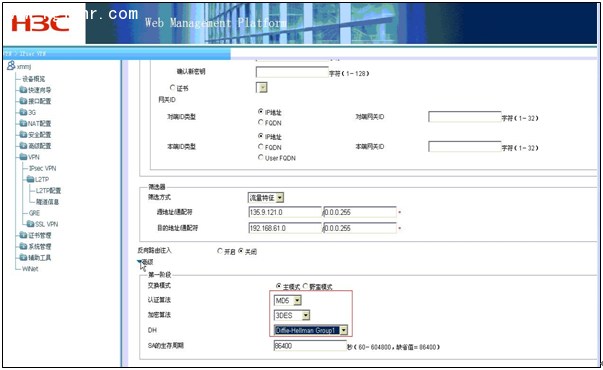 2、登錄H3C路由器,配置網(wǎng)關(guān)地址和加密算法等,如圖3、4、5所示: