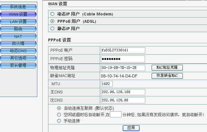 ◆確定之后,如下窗口(WAN為主要設置項)左邊欄會有九個選項.(系統設置,WAN設置,LAN設置,路由,NAT,防火墻動態DNS,其它選項,家長管理)點擊WAN設置,(以PPPOE為例),填上自己的帳號和密碼.不知道的可以向安裝部門索取(一般會在安裝時給的安裝盤的背面寫有)及MAC地址克隆