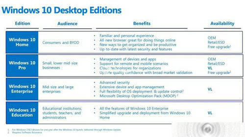 根據(jù)微軟介紹,Windows 10將會(huì)包括七個(gè)不同的版本,分別為家庭版、專業(yè)版、企業(yè)版、教育版、移動(dòng)版、移動(dòng)企業(yè)版以及針對(duì)物聯(lián)網(wǎng)設(shè)備和嵌入式系統(tǒng)設(shè)計(jì)的版本。