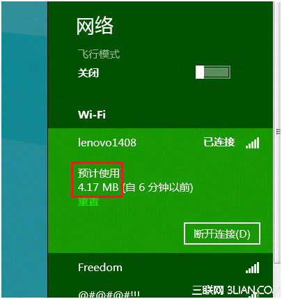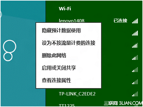操作步驟:1、單擊桌面右下角的信號圖標(biāo);2、和win7不一樣的是單擊win8系統(tǒng)下面的無線信號小圖標(biāo)跳出的選擇;3、右擊選擇已連接好的無線信號,跳出的選項(xiàng)有“顯示和隱藏預(yù)計(jì)數(shù)據(jù)使用”&ldquo...
