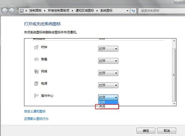 二、在彈出的對話框中,將操作中心選擇關閉,點擊確定就可以了。