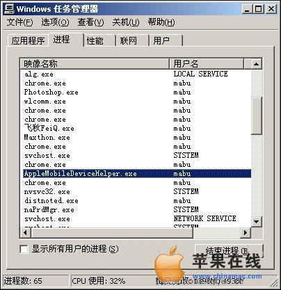 替換前注意備份iTunesMobileDevice.dll文件。如果文件無法替換,說明那是iTunes的后臺服務還在運行,用任務管理器關(guān)閉ituneshelper.exe和下圖中的進程就可解決問題。