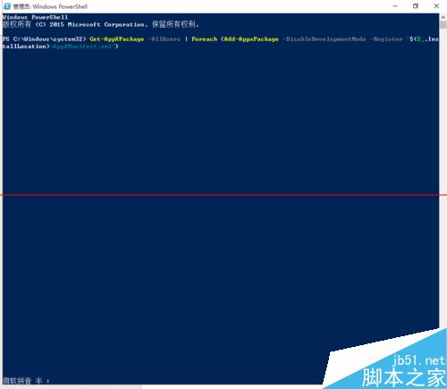 2、執行以下代碼:Get-AppXPackage -AllUsers | Foreach {Add-AppxPackage -DisableDevelopmentMode -Register "$($_.InstallLocation)AppXManifest.xml"}
