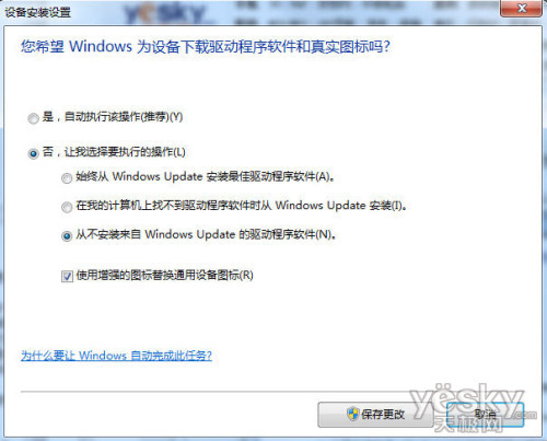 圖示:在Win7“設備安裝設置”窗口中設置自己需要的驅動安裝規則